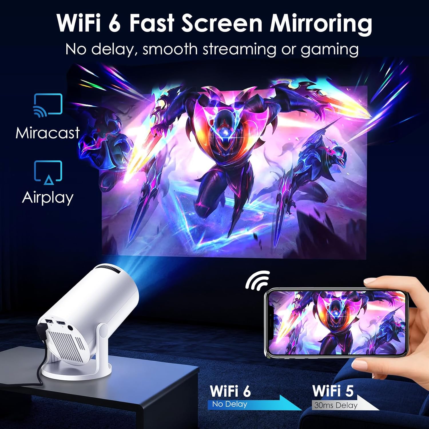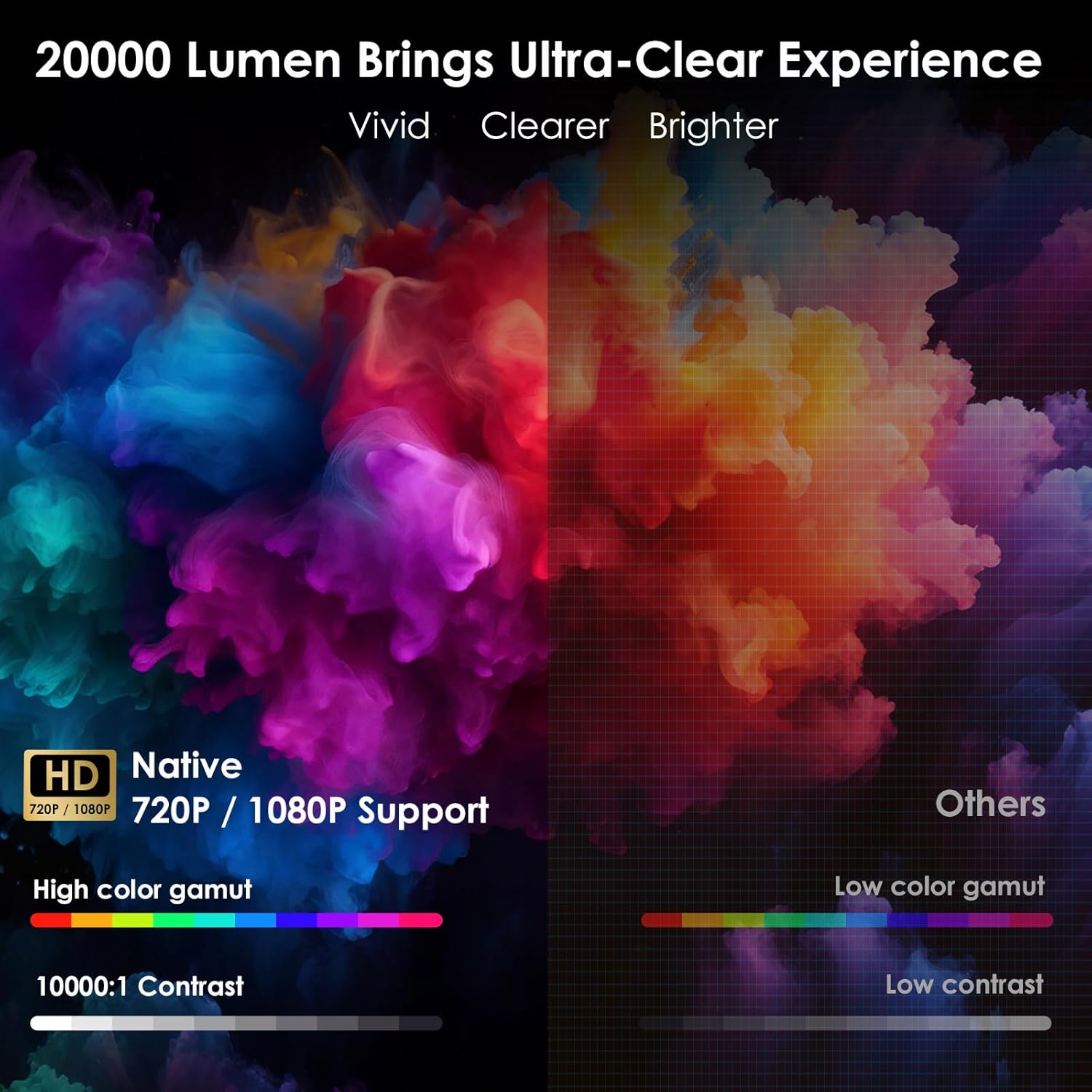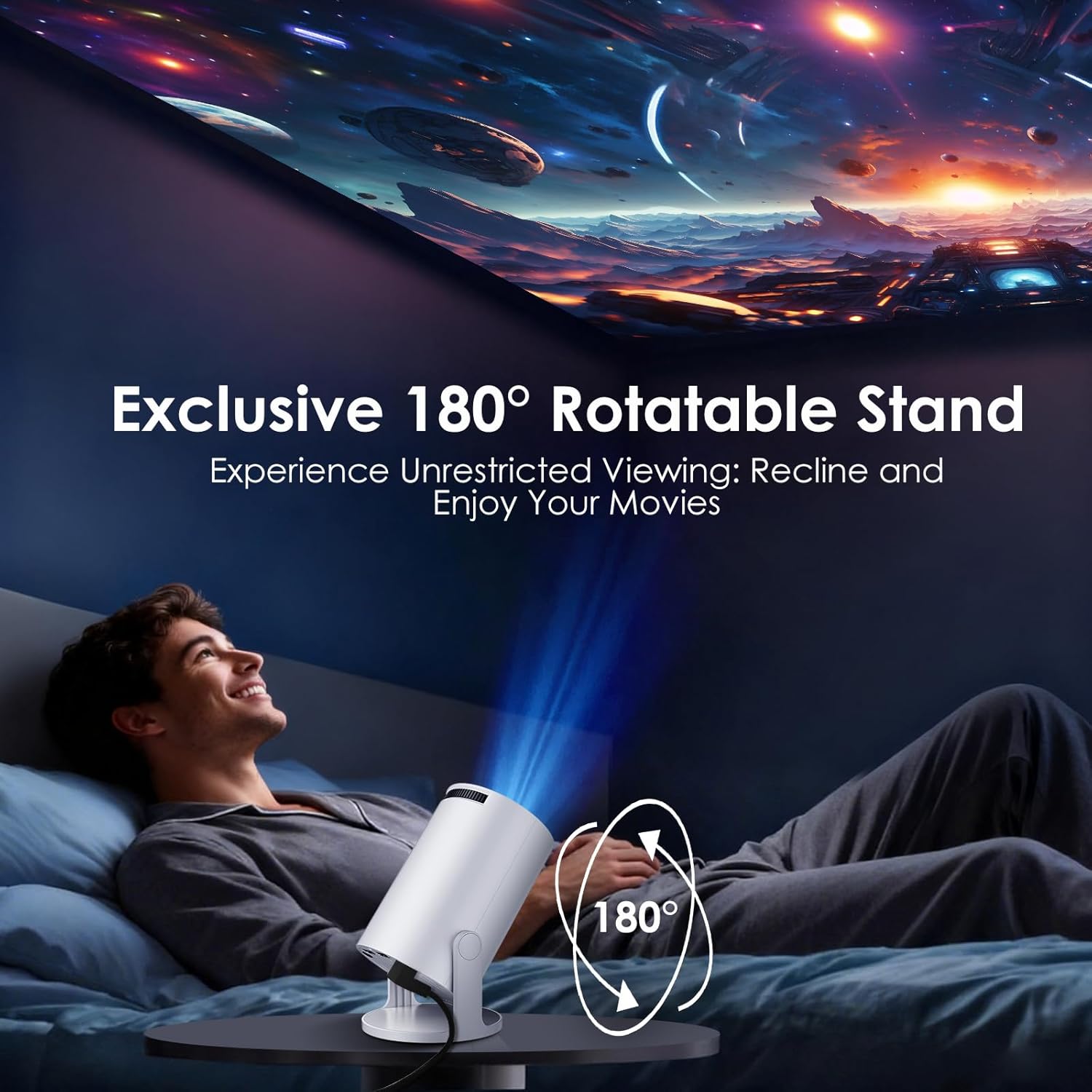 📽️【1080P Support & 20,000 Lumens】The bedroom projector supports 1080P image quality and uses a new 2025 lens. The latest generation of high-light-transmittance technology, coupled with a cannon-style cooling system, ensures crisp, brilliant, and smooth projection. It is especially suitable for playing your favorite movies in the bedroom. It does not take up any space and can be projected anywhere. (Projection screen is not included but available upon request.)