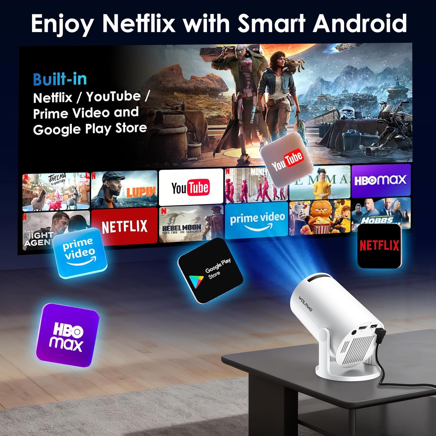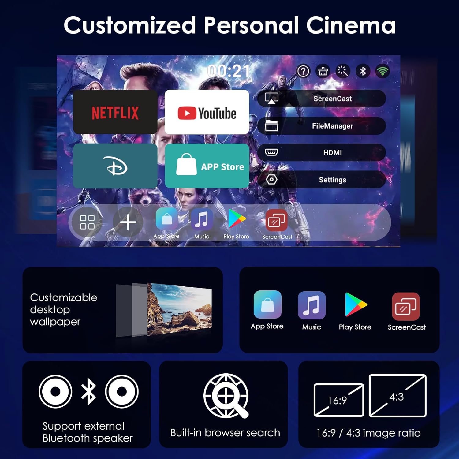 🎬【Built-in Netflix & App Store】The smart projector comes with built-in apps like Netflix, Prime Video, and YouTube, allowing you to instantly connect to your favorite movies without the hassle of mirroring your phone. It also supports the App Store, is compatible with over 1,000 apps, and has continuously updated firmware to meet all your viewing needs. For family gatherings, simply plug it in and place it on the table for instant cinema mode.