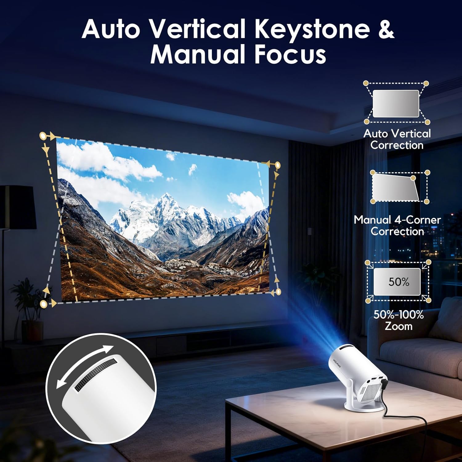 🔍【50% Zoom & Auto Vertical Keystone】WP05 projector supports lossless zoom from 100% to 50% and supports three aspect ratios: 16:9, 16:10, and 4:3. Automatic vertical keystone allows for easy adjustment of the projected image.