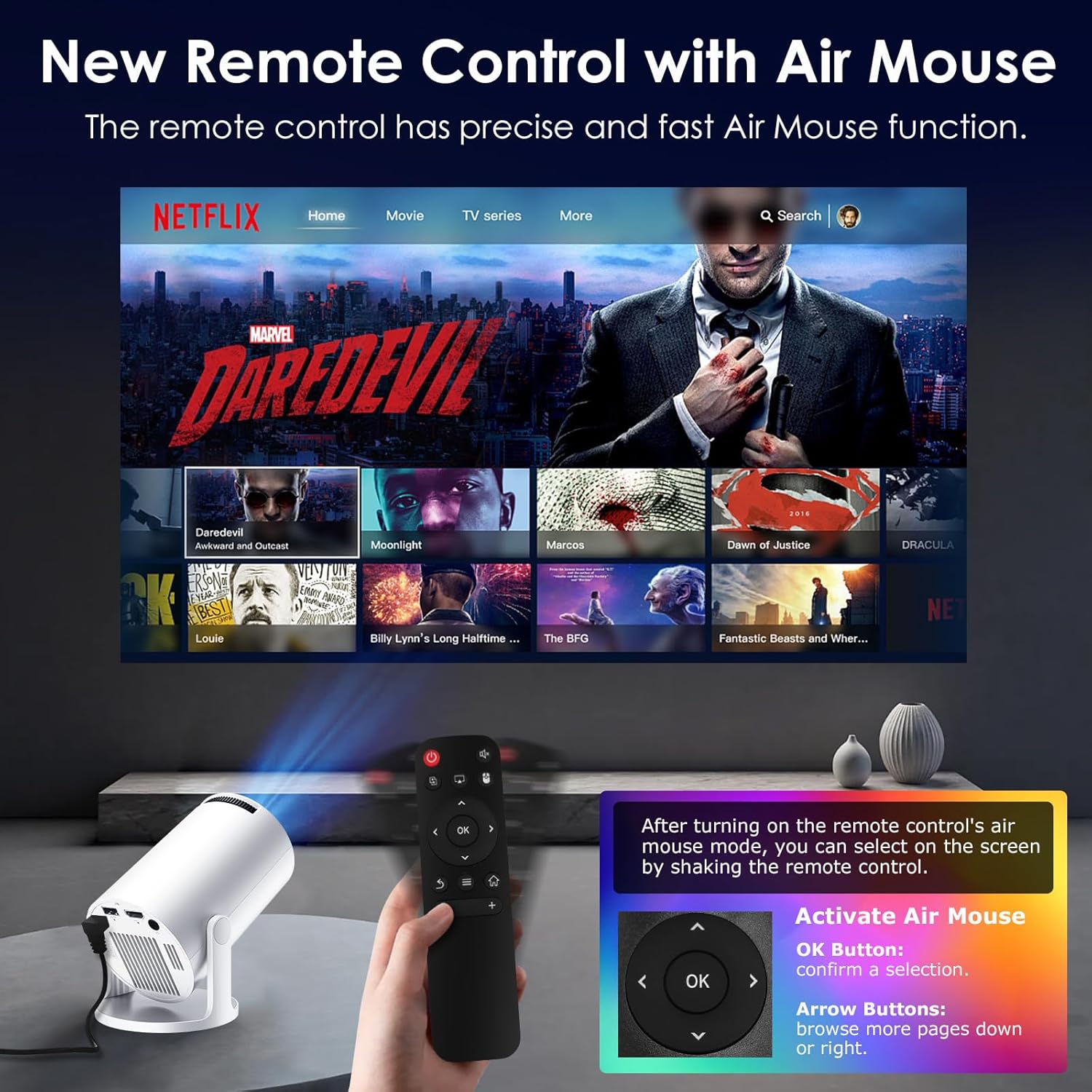 🖱【Built-in Browser & Air Mouse Mode】The video projector features a built-in browser for browsing web content and supports voice input for quick and convenient operation. The new remote control features air mouse mode, allowing you to control the on-screen cursor by moving or shaking the remote.